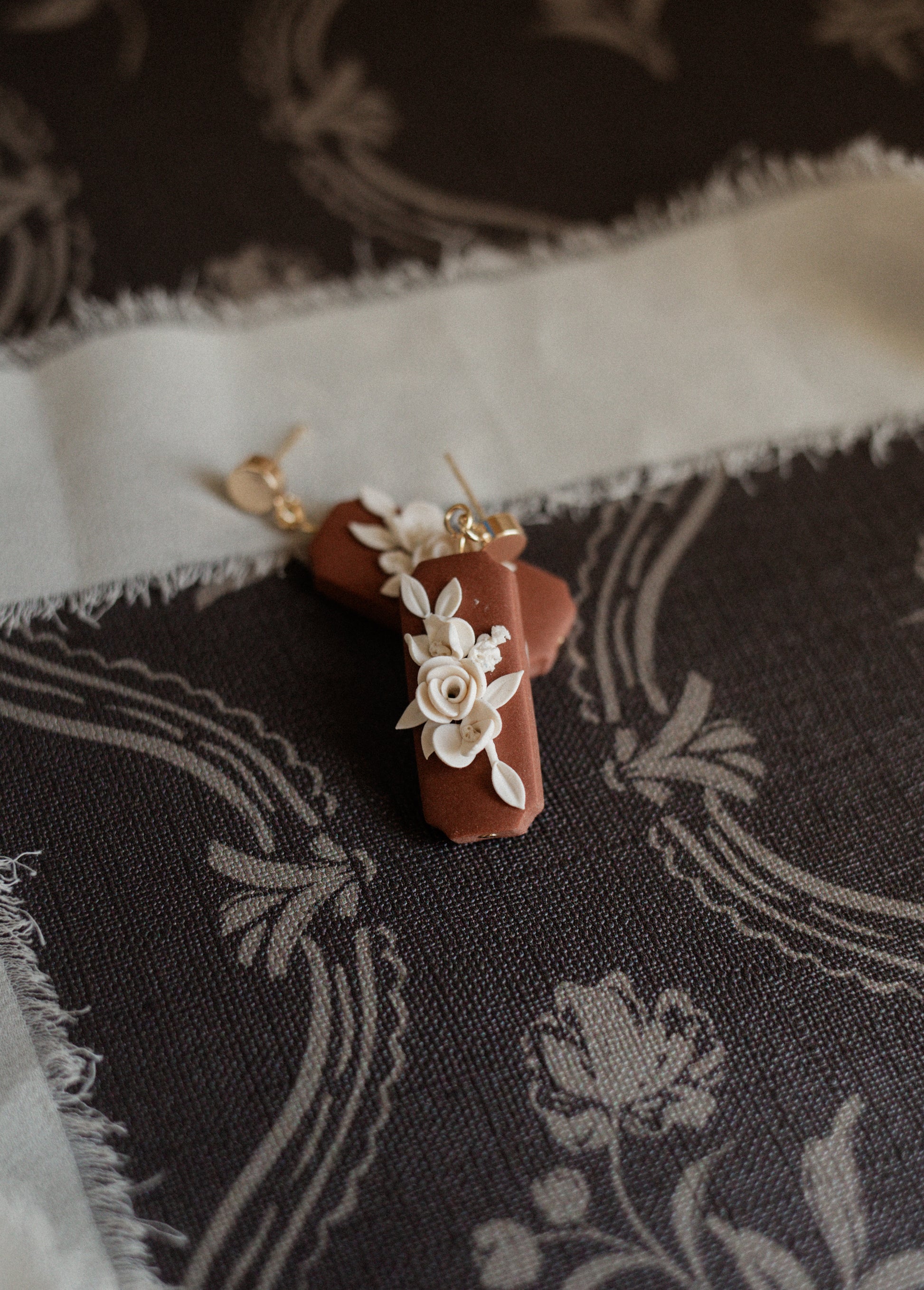 Celebrate the beauty of autumn with the Lilah earrings, a vintage inspired design in rich burnt orange and warm brown tones. Each pair is carefully shaped with timeless curves and adorned with delicate hand sculpted florals, bringing to life the romance of an heirloom piece.